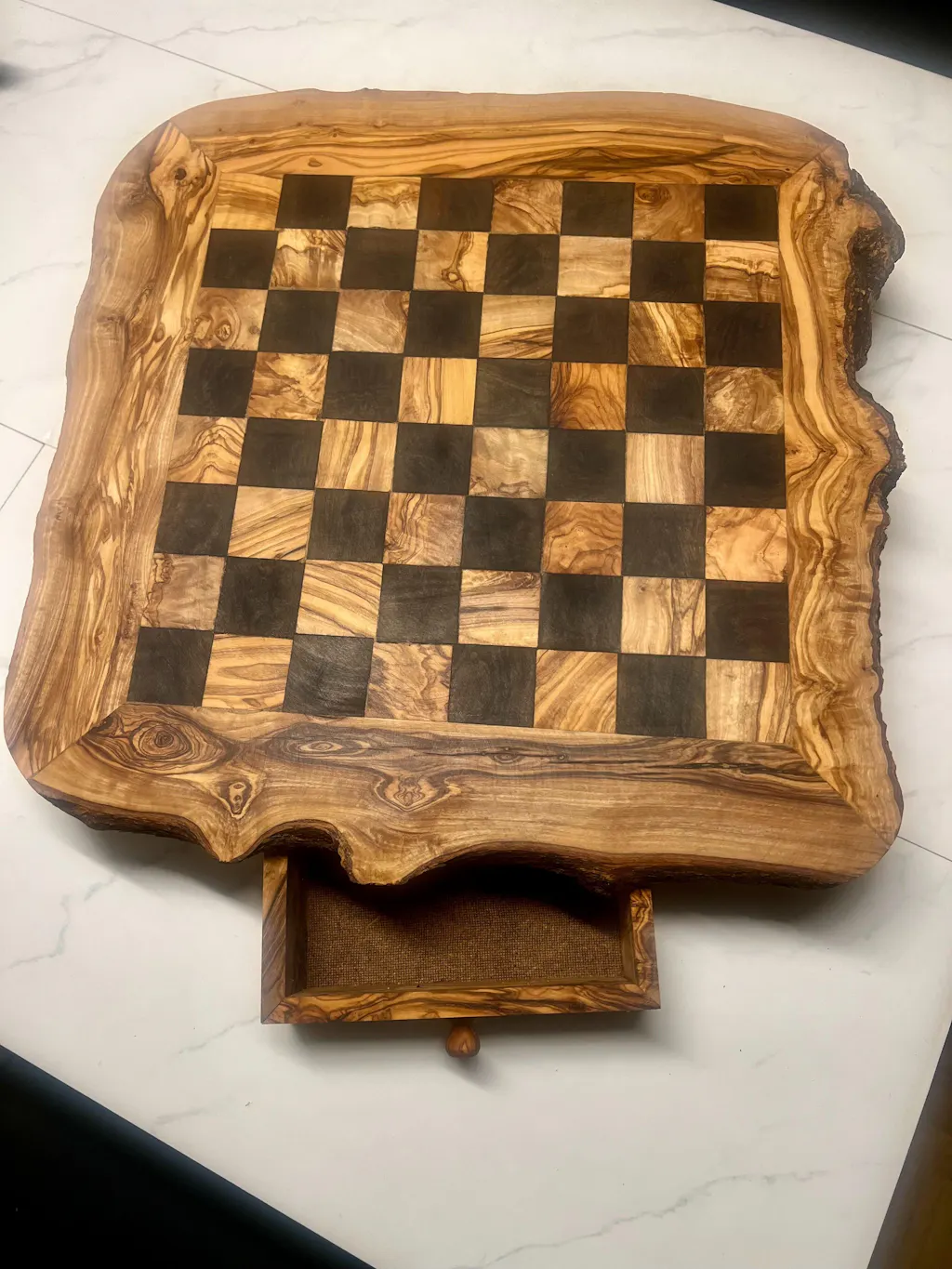 Wer Ordnung schätzt, ohne auf Ästhetik zu verzichten, findet hier die perfekte Lösung: Dieses handgefertigte Schachbrett aus mediterranem Olivenholz verbindet traditionelle Handwerkskunst mit durchdachter Funktionalität. Die integrierte Schublade bewahrt alle Figuren sicher auf – kein Suchen, kein Verlieren, alles griffbereit.